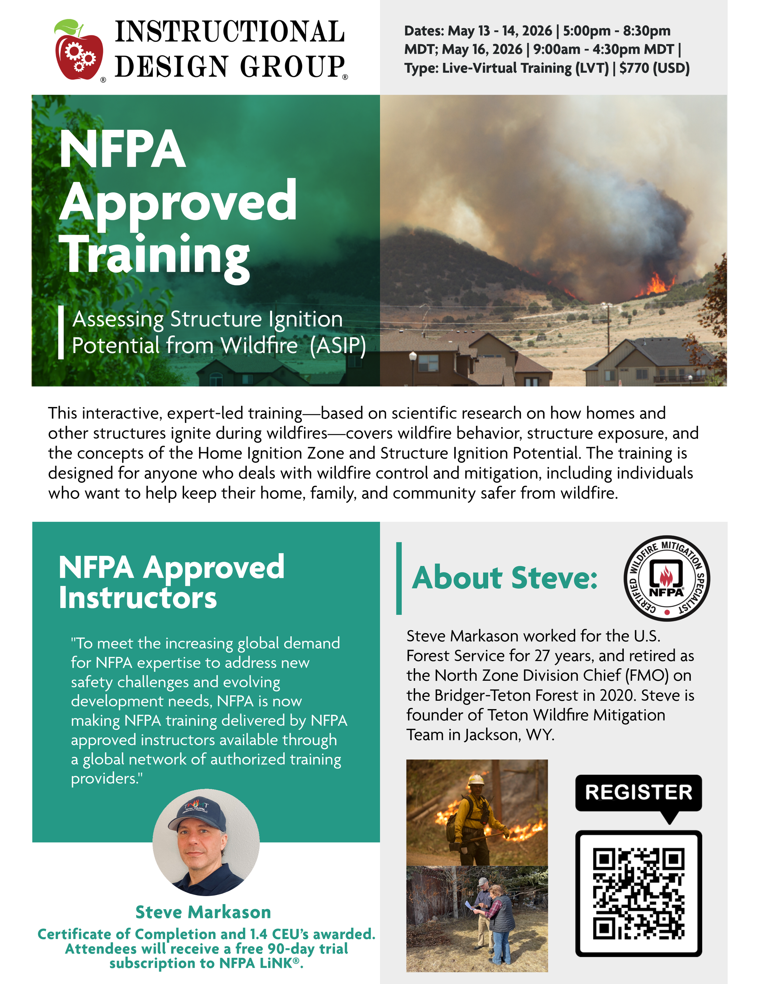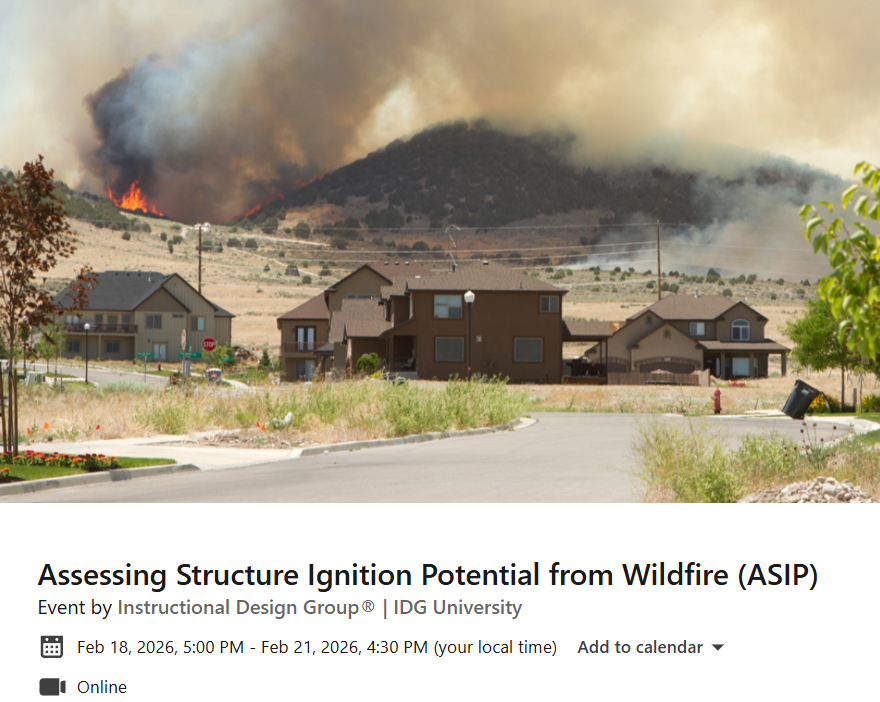 Please join Steve for the upcoming NFPA Assessing Structure Ignition Potential from Wildfire course. February 18 - 21, 2026. Virtual on Zoom - $770/student.